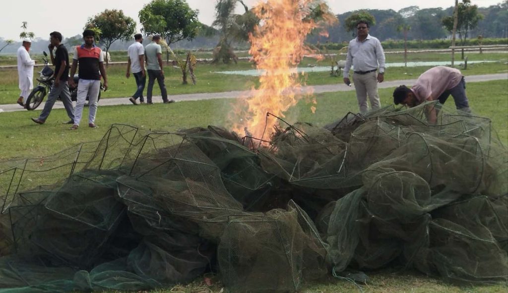 এসময় গোপালগঞ্জের জেলা প্রশাসক কাজী মাহবুবুল আলম, টুঙ্গিপাড়া উপজেলা নির্বাহী কর্মকর্তা মোঃ মঈনুল হক,উপজেলা চেয়ারম্যান বাবুল শেখ, সিনিয়র মৎস্য কর্মকর্তা দেবাশীষ বাছাড়, পৌর কাউন্সিলর মঈনুল ইসলাম অপু প্রমূখ উপস্থিত ছিলেন।ইউএনও মোঃ মঈনুল হক বলেন, বিভিন্ন শ্রেণী পেশার মানুষ খাল ও নদীতে অবৈধ চায়না দুয়ারি জাল ফেলে দেশীয় প্রজাতির মাছ ধ্বংস করে চলছে। মাছের সঙ্গে আটকা পড়ে খাল ও নদীর জীব বৈচিত্র নষ্ট হচ্ছে। তাই দেশীয় মাছ জলজপ্রাণী রক্ষার্থে নদী ও খালে অভিযান চালিয়ে এসব জাল উদ্ধার করা হয়। পরে সেগুলো পুড়িয়ে ধ্বংস করা হয়। দেশীয় মাছ রক্ষার্থে আগামীতেও এরকম অভিযান অব্যাহত থাকবে।