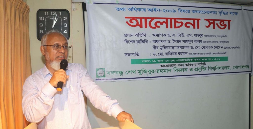 গোপালগঞ্জের বঙ্গবন্ধু শেখ মুজিবুর রহমান বিজ্ঞান ও প্রযুক্তি বিশ্ববিদ্যালয়ে তথ্য অধিকার আইন-২০০৯ বিষয়ে জনসচেতনতা বৃদ্ধির লক্ষে আলোচনা সভা অনুষ্ঠিত হয়েছে।মঙ্গলবার (১১জুন) দুপুর ১২টা থেকে দেড়টা পর্যন্ত বিশ্ববিদ্যালয়ের একাডেমিক ভবনের ৫০১ নং কক্ষে এ সভা অনুষ্ঠিত হয়।
