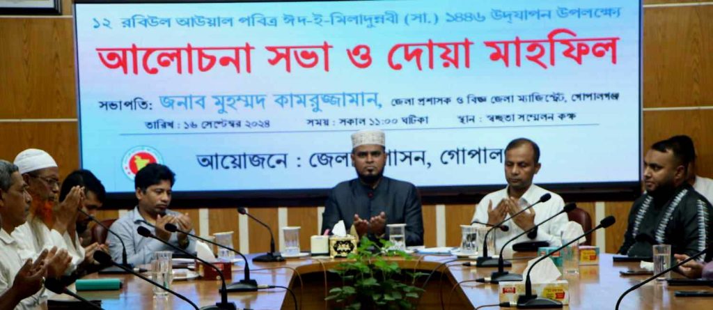 গোপালগঞ্জে ঈদ এ মিলাদুন্নবী উপলক্ষে আলোচনা সভা ও দোয়া মাহফিলের অনুষ্ঠিত হয়েছে।আজ সোমবার(১৬ সেপ্টেম্বর)দুপুরে জেলা প্রশাসনের উদ্যোগে এই অনুষ্ঠানের আয়োজন করা হয়।