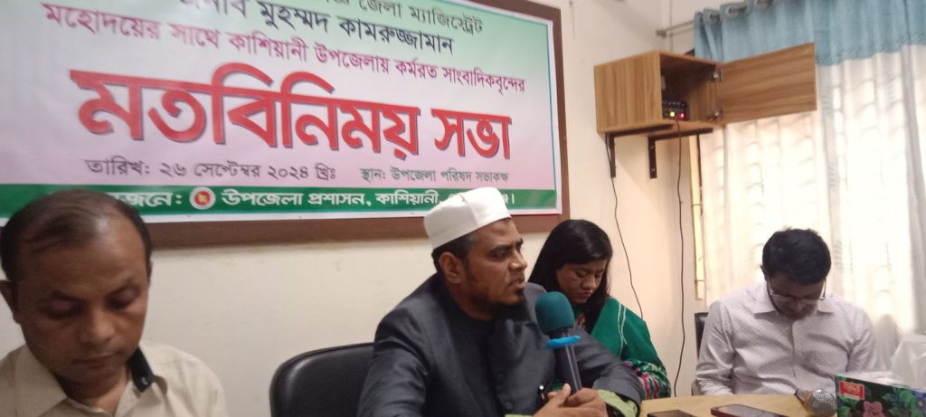 কাশিয়ানী উপজেলা নির্বাহী অফিসার মুহাম্মদ রাসেদুজ্জামানের সভাপতিত্বে আজ বৃহস্পতিবার (২৬ সেপ্টেম্বর) বেলা সাড়ে ১১ টায় উপজেলা পরিষদ সভাকক্ষে এ মতবিনিময় সভা অনুষ্ঠিত হয়। সভায় প্রধান অতিথি জেলা প্রশাসক মুহম্মদ কামরুজ্জামান উপজেলা এলাকায় কর্মরত সকল সংবাদকর্মীদের সঠিক তথ্য প্রকাশ করতে অনুরোধ করেন। তিনি তার বক্তব্যে দূর্নিতিমুক্ত গোপালগঞ্জ গড়তে সকল পেশা শ্রেণীর মানুষের কাছে সহযোগীতা কমনা করেন। জেলা প্রশাসকের সাথে মতবিনিময় সভায় উপস্থিত ছিলেন অতিঃ জেলা ম্যাজিস্ট্রেট মোছাঃ নাজমুন নাহান অতিঃ জেলা প্রসাশক মোঃ গোলাম কবির। এসময়ে বক্তব্য রাখেন সাংবাদিক মোঃ নিজামুল আলম মোরাদ,মোঃ ফায়েকুজামান, মোঃ পরশ উজির, ডাক্তার মোঃ সোহান, মোঃ গিয়াসউদ্দিন ,মোঃ রিজাউল করিম প্রমূখ। এর পূর্বে তিনি সরকারি কর্মকর্তা ও কর্মচারিদের সাথেও মতবিনিময় সভা করেন।