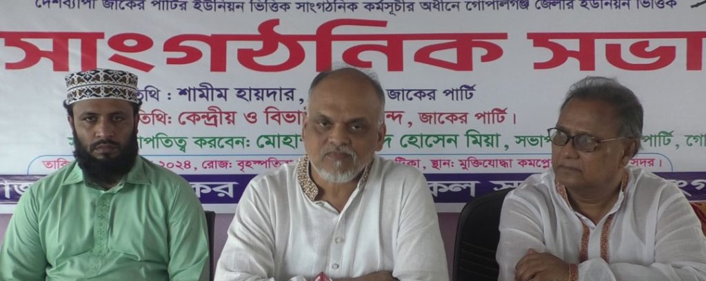 গোপালগঞ্জ জেলা জাকের পার্টি সভাপতি সাজ্জাদ হোসেন মিয়ার সভাপতিত্বে অনুষ্ঠিত সভায় অন্যান্যের মধ্যে উপস্থিত ছিলেন, অতিরিক্ত মহাসচিব মাহাবুবুর রহমান হায়দার,