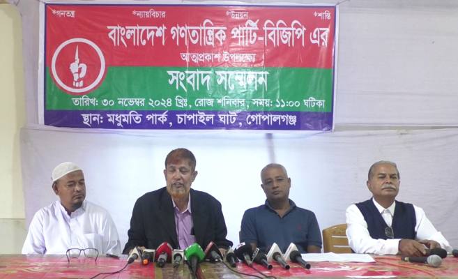 গোপালগঞ্জে “বাংলাদেশ গনতান্ত্রিক পার্টি-বিজিপি” নামে নতুন একটি রাজনৈতিক দলের ঘোষনা দেয়া হয়েছে।আজ শনিবার (৩০ নভেম্বর)দুপুরে সদর উপজেলার চাপাইল এলাকায় মধুমতি পার্কে অনুষ্ঠিত সংবাদ সম্মেলনে এ ঘোষনা দেন নবগঠিত দলের আহবায়ক মোঃ সাইফুর রশিদ চৌধুরী।এ সময় দলের তিন যুগ্ম-আহবায়ক জুলিয়াছ খান ঠাকুর, শেখ ফরিদ আহমেদ ও মোঃ ইয়ার আলী উপস্থিত ছিলেন।