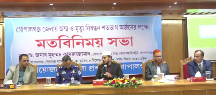 গোপালগঞ্জ জেলায় জন্ম ও মৃত্যু নিবন্ধন শতভাগ অর্জনের লক্ষ্যে এক মতবিনিময় সভা অনুষ্ঠিত হয়।আজ রবিবার (৮ ডিসেম্বর) বিকেলে গোপালগঞ্জ পৌরসভা মিলনায়তনে অনুষ্ঠিত এ মতবিনিময় সভা অনুষ্ঠিত হয়। সভায় সভাপতিত্ব করেন জেলা প্রশাসক মুহম্মদ কামরুজ্জামান।আগামী ৩১ ডিসেম্বরের মধ্যে জেলায় সকল ইউনিয়ন ও পৌর এলাকার জন্ম ও মৃত্যু নিবন্ধন শতভাগ অর্জনের জন্য নানা কর্মপরিকল্পনা গ্রহণ করা হয়।