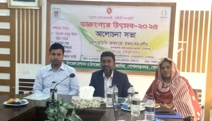 গোপালগঞ্জে  তারুণ্যের উৎসব উপলক্ষে আলোচনা সভা অনুষ্ঠিত হয়েছে। আজ বৃহস্পতিবার (১৩ ফেব্রুয়ারী) সকাল সাড়ে দশটায় গোপালগঞ্জ সদর উপজেলা পরিষদ হলরুমে উপজেলা প্রশাসন ও উপজেলা সমাজসেবা অফিস এ আলোচনা সভার আয়োজন করে। এতে প্রধান অতিথির বক্তব্য দেন সমাজসেবা অধিদপ্তরের গোপালগঞ্জ জেলা সমাজসেবা কার্যালয়ের উপ-পরিচালক মোঃ হারুন অর রশীদ।