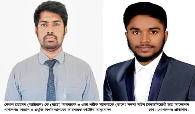 বৈষম্যবিরোধী ছাত্র আন্দোলন গোপালগঞ্জ বিজ্ঞান ও প্রযুক্তি বিশ্ববিদ্যালয় শাখার আহবায়ক কমিটির অনুমোদন দেয়া হয়েছে।৬ মাসের এ আহবায়ক কমিটিতে বেলাল হোসেন (আরিয়ান) কে আহবায়ক ও ওমর শরীফ সরকারকে সদস্য সচিব করে ৮১ সদস্য বিশিষ্ট কমিটি গঠান করা হয়েছে।