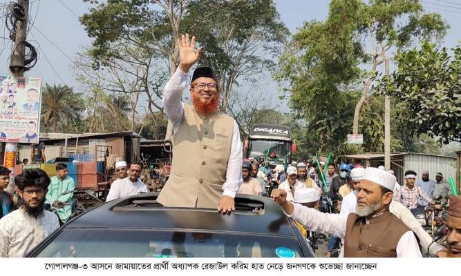আওয়ামী লীগের দূর্গ বলে খ্যাত, সাবেক প্রধানমন্ত্রী ও আওয়ামী লীগ সভাপতি শেখ হাসিনার নিজ নির্বাচনী এলাকা গোপালগঞ্জের কোটালীপাড়া উপজেলায় ব্যাপক শোডাউন করেছেন জেলা জামায়াতের আমীর ও আগামী জাতীয় সংসদ নির্বাচনে গোপালগঞ্জ-৩ (কোটালীপাড়া-টুঙ্গিপাড়া) আসনের জামায়াত ইসলামীর প্রার্থী অধ্যাপক রেজাউল করিম।