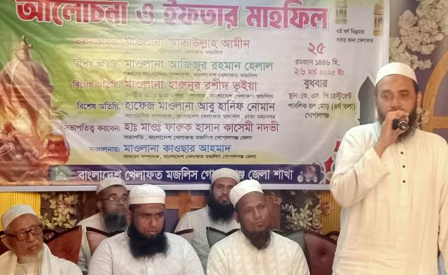 বাংলাদেশ ইসলামী খেলাফত মজলিস গোপালগঞ্জ জেলা শাখার সভাপতি হাফেজ মাওলানা ফারুক হাসানের সভাপতিত্বে অনুষ্ঠিত আলোচনা সভায় কেন্দ্রীয় সাংগঠনিক সম্পাদক মাওঃ আজিজুর রহমান হেলাল, গোপালগঞ্জ জেলা শাখার সাধারন সম্পাদক মাওঃ কাওসার আহমাদ, যুগ্ম সাধারন সম্পাদক মুফতি গাউসুর রহমান বক্তব্য রাখেন।
