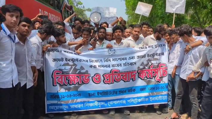 ক্রাফ্ট ইনস্ট্রাকটরদের নিয়োগবিধি সংশোধনসহ ৬ দফা বাস্তবায়নের দাবীতে গোপালগঞ্জে ঢাকা-খুলনা মহাসড়ক অবরোধ করে বিক্ষোভ-সমাবেশ করেছে গোপালগঞ্জ পলিটেকনিকের শিক্ষার্থীরা।