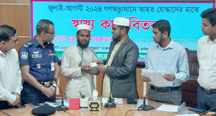 জুলাই-আগস্ট গণঅভ্যুত্থানে আহতদের হেলথ কার্ড প্রদান করা হয়েছে। গোপালগঞ্জ জেলায় মোট ১৯ জন তালিকাভুক্ত আহত রয়েছেন। এদের মধ্যে ১২ জনকে হেলথ কার্ড বিতরন করা হয়।আজ মঙ্গলবার (২৫ মার্চ) দুপুরে জেলা প্রশাসকের সম্মেলন কক্ষে আনুষ্ঠানিক ভাবে এই হেলথ কার্ড বিতরন করেন জেলা প্রশাসক মুহম্মদ কামরুজ্জামান।এ সময় পুলিশ সুপার মোঃ মিজানুর রহমান, সিভিল সার্জন ডাঃ আবু সাইদ মো ফারুক, ২৫০ শয্যা বিশিষ্ট জেনারেল হাসপাতালের তত্ত্বাবধায়ক ডা জীবীতেষ বিশ।বাস গোপালগঞ্জ মেডিকেল কলেজ হাসপাতালের পরিচালক ডাঃ প্রেমানন্দ মন্ডল এবং গনমাধ্যম কর্মিগন উপস্থিত ছিলেন।