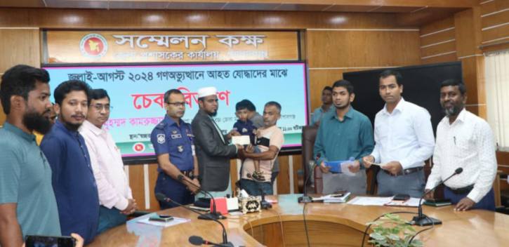 জুলাই-আগস্ট গণঅভ্যুত্থানে আহতদের মাঝে আর্থিক অনুদানের চেক বিতরণ করা হয়েছে। গোপালগঞ্জ জেলায় মোট ৩৮জন তালিকাভুক্ত আহতদের মধ্যে আজ ৬জনকে চেক দেয়া হয়। এর মধ্যে এ কেটাগড়িতে চারজনকে ২লক্ষ করে ও বি কেটাগড়ির ২জনকে ১লক্ষ টাকা করে চেক তুলে দেন জেলা প্রশাসক মুহম্মদ কামরুজ্জামান। । আজ বৃহস্পতিবার (২৭ মার্চ) দুপুরে জেলা প্রশাসকের সম্মেলন কক্ষে আনুষ্ঠানিক ভাবে এসব আর্থিক অনুদানের এই চেক বিতরন করা হয়। এ সময় পুলিশ সুপার মোঃ মিজানুর রহমান, আড়াইশ শয্যা বিশিষ্ট জেনারেল হাসপাতালের তত্ত্বাবধায়ক ডাঃ জীবীতেষ বিশ্বাস, সমাজসেবা অধিদপ্তরের উপ-পরিচালক মোঃ হারুন অর রশিদ, গনমাধ্যম কর্মি ও আহত পরিবারের সদস্যরা উপস্থিত ছিলেন।