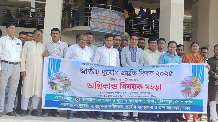 “দুর্যোগের পূর্বাভাস প্রস্তুতি, বাঁচায় প্রান ক্ষয়ক্ষতি” প্রতিপাদ্যে গোপালগঞ্জের টুঙ্গিপাড়ায় জাতীয় দুর্যোগ প্রস্তুতি দিবস পালিত হয়েছে। দিবসটি উপলক্ষে আজ সোমবার (১০ মার্চ) বেলা ১০ টায় টুঙ্গিপাড়া উপজেলা পরিষদ চত্বরে অগ্নিকাণ্ড বিষয়ক মহড়া অনুষ্ঠিত হয়।টুঙ্গিপাড়া উপজেলা প্রশাসন ও দুর্যোগ ব্যবস্থাপনা অধিদপ্তরের আয়োজনে ফায়ার সার্ভিস স্টেশনের সদস্যরা ভূমিকম্প, অগ্নিকাণ্ড ও বজ্রপাত বিষয়ক মহড়া প্রদর্শন করেন।