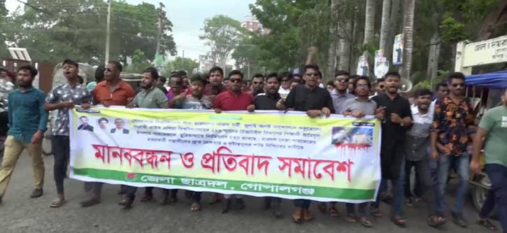 ছাত্রদল কর্মী জাহিদুল ইসলাম পারভেজ হত্যাকাণ্ডের প্রতিবাদে ও দোষীদের দ্রুত গ্রেপ্তারের দাবিতে গোপালগঞ্জে মানববন্ধন ও বিক্ষোভ মিছিল করেছে জেলা ছাত্রদল। সোমবার (২১ এপ্রিল) বেলা ১১টার দিকে স্থানীয় প্রেসক্লাবের সামনে বঙ্গবন্ধু সড়কের উপর দাঁড়িয়ে হাতে হাত ধরে ঘন্টাব্যাপী এ মানববন্ধন কর্মসূচি পালন করে। এ সময় বিভিন্ন ধরনের প্ল্যাকার্ড প্রদর্শন করে স্লোগান দেয় মানববন্ধনকারীরা।