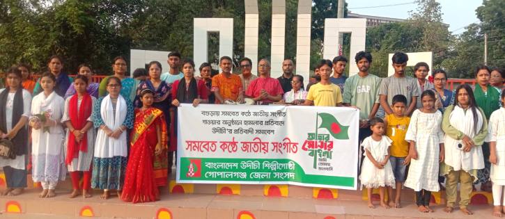 বগুড়ায় সমবেত কন্ঠে জাতীয় সংগীত গাওয়ার অনুষ্ঠানে হামলার প্রতিবাদে গোপালগঞ্জে সমবেত কন্ঠে জাতীয় সংগীত পরিবেশন করা হয়েছে।গোপালগঞ্জ উদীচী শিল্পী গোষ্ঠী প্রতিবাদী সমাবেশ হিসেবে এই অনুষ্ঠানের আয়োজন করে। আজ শুক্রবার ( ১৬ মে) বিকেলে স্থানীয় পৌর পার্কের কেন্দ্রীয় শহীদ মিনারের পাদদেশে দাড়িয়ে জাতীয় সংগীত পরিবেশন করে উদীচী জেলা সংসদের শিল্পীবৃন্দ। এ কর্মসূচীতে উদীচী শিল্পী গোষ্ঠী ছাড়াও জেলার বিভিন্ন সাংস্কৃতিক সংগঠনের শিল্পীরা অংশ গ্রহণ করেন।