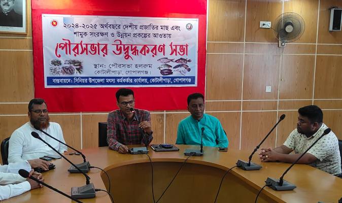 গোপালগঞ্জের কোটালীপাড়ায় দেশীয় প্রজাতীর মাছ রক্ষা ও মৎস্য আইন বাস্তবায়নে উদ্বুদ্ধকরণ সভা অনুষ্ঠিত হয়েছে।আজ শুক্রবার (২০জুন) কোটালীপাড়া পৌরসভা হলরুমে দেশীয় প্রজাতির মাছ এবং শামুক সংরক্ষণ ও উন্নয়ন প্রকল্পের আওতায় উপজেলা সিনিয়র মৎস্য কর্মকর্তার কার্যালয়ের বাস্তবায়নে এ উদ্বুদ্ধকরণ সভা অনুষ্ঠিত হয়।