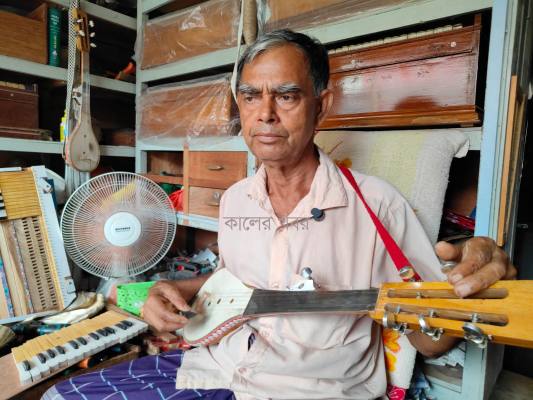 দেশীয় বাদ্যযন্ত্র বাজিয়ে গান করছেন শিল্পী অজিৎ হালদার