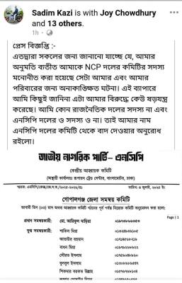 এতদ্বারা সকলের জন্য জানানো যাচ্ছে যে, আমার অনুমতি ব্যতীত আমাকে এনসিপি দলেরকমিটির সদস্য মনোনীত করা হয়েছে সেটা আমার এবং আমার পরিবারের জন্য অনাকাঙ্খিত ঘটনা। এই ব্যাপারে আমি কিছুই জানি না এটা আমার বিরুদ্ধে কেউ ষড়যন্ত্র করেছে। আমি কোন রাজনৈতিক দলের সদস্য না এবং এনসিপি দলেরও সদস্যও না। তাই আমার নাম এনসিপি দলের কমিটি থেকে বাদ দেওয়ার অনুরোধ রইলো।