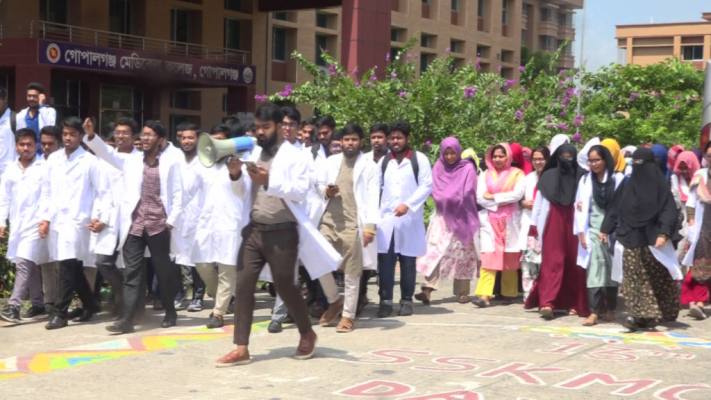 ঢাকার মিটফোর্ডে পাশবিক কায়দায় সোহাগ হত্যাকাণ্ড এবং দেশব্যাপী চলমান চাঁদাবাজি, ধর্ষণ ও হত্যার প্রতিবাদে গোপালগঞ্জ মেডিকেল কলেজের শিক্ষার্থীরা বিক্ষোভ মিছিল ও সমাবেশ করেছে।