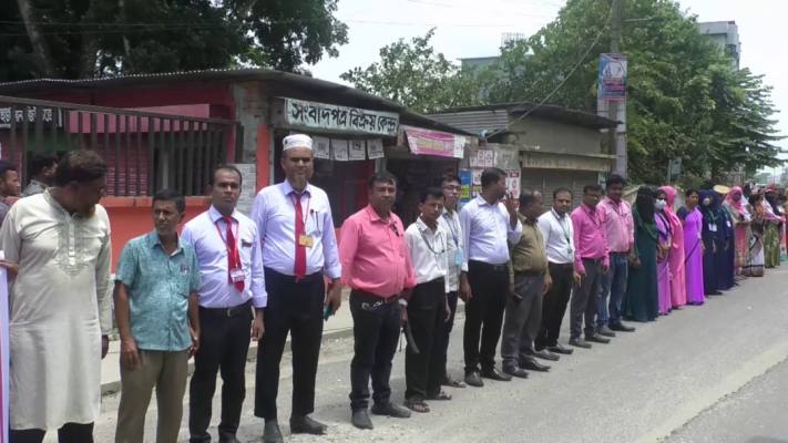 প্রাথমিক বৃত্তি পরীক্ষায় কিন্ডারগার্টেন ও বেসরকারি প্রাথমিক বিদ্যালয়ের শিক্ষার্থীদের অংশগ্রহণের সুযোগের দাবীতে গোপালগঞ্জে মানববন্ধন কর্মসূচী পালিত হয়েছে। বাংলাদেশ কিন্ডারগার্টেন এসোসিয়েশন গোপালগঞ্জ জেলা শাখা এই কর্মসূচীর আয়োজন করে।আজ মঙ্গলবার (১২ আগস্ট) সকাল ১১টায় স্থানীয় প্রেস ক্লাবের সামনের সড়কে হাতে হাত ধরে ঘন্টাব্যাপী মানববন্ধন করে গোপালগঞ্জের বিভিন্ন কিন্ডারগার্টেন ও বেসরকারি প্রাথমিক বিদ্যালয়ের শিক্ষকরা। মানবন্ধন চলাকালে এসোসিয়েশনের সভাপতি জাকারিয়া ইসলাম ধীরাজ, শিক্ষক মাহাবুবুল হক শিলো, মোহম্মদ কামাল হোসেন ও বি এম আব্বাস আলী বক্তব্য রাখেন।