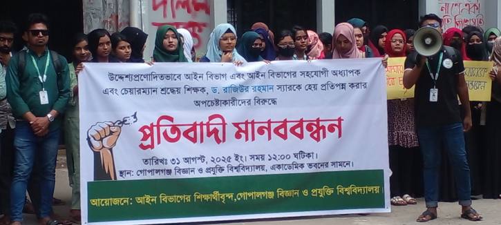 গোপালগঞ্জ বিজ্ঞান ও প্রযুক্তি বিশ্ববিদ্যালয়ের সহযোগি অধ্যাপক ও আইন বিভাগের চেয়ারম্যান ড. রাজিউর রহমানের বিরুদ্ধে অপপ্রচার ও হয়রানীর বিরুদ্ধে মানববন্ধন ও বিক্ষোভ সমাবেশ করেছে আইন বিভাগের শিক্ষার্থীরা।আজ রোববার (৩১ আগস্ট) দুপুরে আইন বিভাগের সামনে থেকে একটি বিক্ষোভ মিছিল শুরু করে প্রশাসনিক ভবনের সামনে গিয়ে শেষ হয়।