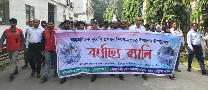 গোপালগঞ্জে আন্তর্জাতিক দুর্যোগ প্রশমন দিবস পালন উপলক্ষে র্যালী , আলোচনাসভা ও মহড়া অনুষ্ঠিত হয়েছে। আজ সোমবার (১৩ অক্টোবর) সকালে জেলা প্রশাসকের কার্যালয়ের সামনে থেকে একটি র্যালী বের করা হয়। র্যালীটি জেলা শহরের বিভিন্ন সড়ক প্রদক্ষিণ করে জেলা প্রশাসকের কার্যালয়ের সামনে সুশাসন চত্বরে শেষ হয়। পরে সেখানে গোপালগঞ্জ ফায়ার সার্ভিস স্টেশনের সদস্যরা ভূমিকম্প ও অগ্নিকাণ্ড বিষয়ক মহড়া প্রদর্শন করেন।