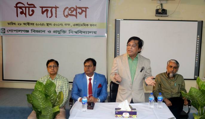 জুলাই বিল্পব পরবর্তি গোপালগঞ্জ বিজ্ঞান ও প্রযুক্তি বিশ্ববিদ্যালয় (গোবিপ্রবি) প্রশাসনের বর্ষপূতি উপলক্ষ্যে গণমাধ্যমকর্মীদের সঙ্গে মতবিনিময় করেছেন উপাচার্য অধ্যাপক ড. হোসেন উদ্দিন শেখর। আজ মঙ্গলবার (২৮ অক্টোবর) দুপুরে একাডেমিক ভবনের ৫০১ নং কক্ষে মিট দ্য প্রেস অনুষ্ঠানের আয়োজন করা হয়। সেখানে বিগত এক বছরে প্রশাসনের নানা কর্মকাণ্ডের তথ্য উপস্থাপন করা হয়।