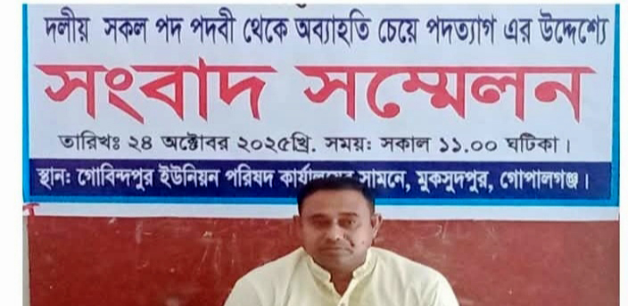 মুকসুদপুরের গোবিন্দপুর ইউনিয়ন আওয়ামী লীগ সভাপতির পদত্যাগ