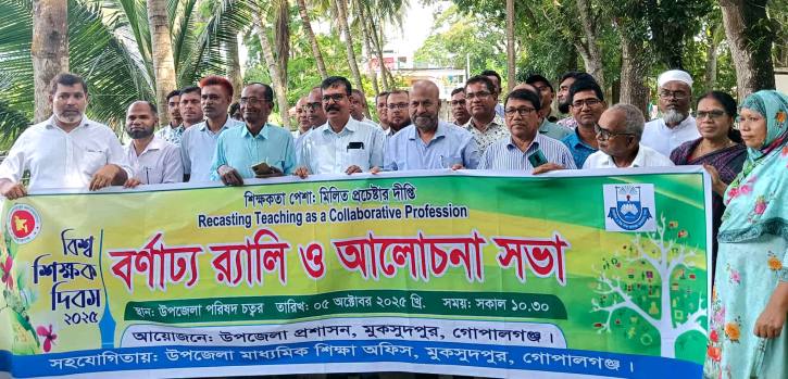 গোপালগঞ্জের মুকসুদপুর উপজেলায় বিশ্ব শিক্ষক দিবস উপলক্ষে র‌্যালী ও আলোচনা সভা অনুষ্ঠিত হয়েছে। আজ রবিবার (৫ অক্টোবর) সকালে মুকসুদপুর উপজেলা প্রশাসনের আয়োজনে এবং উপজেলা মাধ্যমিক শিক্ষা অফিসের সহযোগিতায় উপজেলা পরিষদ চত্বর থেকে একটি র‌্যালী বের করা হয়। র‌্যালীটি উপজেলা শহরের প্রধান সড়কগুলো প্রদক্ষিণ করে।
