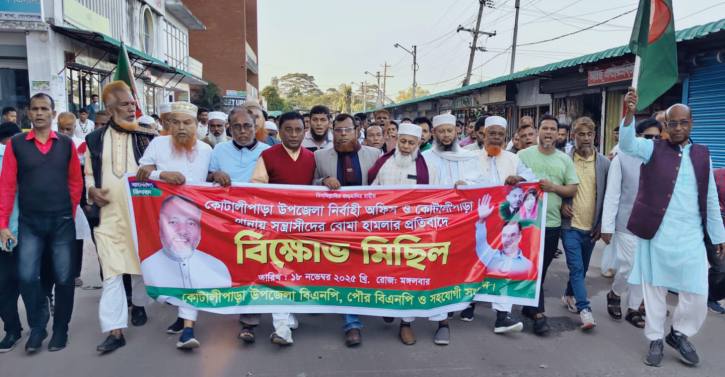 গোপালগঞ্জের কোটালীপাড়া  উপজেলা পরিষদ ও থানায় ককটেল হামলার প্রতিবাদে বিক্ষোভ মিছিল ও সমাবেশ করেছে উপজেলা বিএনপি ও সহযোগী সংগঠনের নেতৃবৃন্দ। আজ মঙ্গলবার (১৮ নভেম্বর)  বিকেলে পৌর মার্কেট চত্বর থেকে একটি বিক্ষোভ মিছিল বের করে। মিছিলটি উপজেলা সদরের  প্রধান প্রধান সড়ক প্রদক্ষিণ করে ঘাঘর বাজারের চৌরঙ্গীতে এসে শেষ করে।
