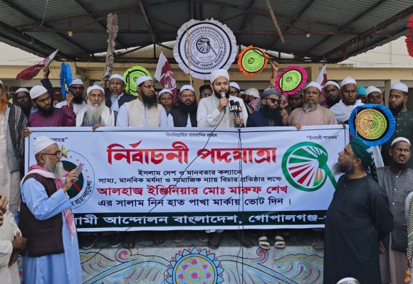 গোপালগঞ্জ-৩ (কোটালীপাড়া-টুঙ্গিপাড়া) আসনে ইসলামী আন্দোলন বাংলাদেশ মনোনীত প্রার্থী আলহাজ্ব ইঞ্জিনিয়ার মোঃ মারুফ শেখ হাতপাখা প্রতীকে নির্বাচনী পথযাত্রা শুরু করেছেন। আজ রবিবার (৭ ডিসেম্বর) দুপু‌রে উপজেলার পৌর মার্কেট থেকে দলীয় নেতাকর্মীদের সা‌থে নিয়ে পথযাত্রা শুরু করেন। পথযাত্রা‌টি  উপ‌জেলা সদ‌রের প্রধান প্রধান সড়ক পদক্ষিণ করে উপজেলা শিল্পকলা একাডেমি চত্ত্বরে এসে শেষ করর। সেখা‌নে আলোচনা সভায়  ইসলামী আন্দোলন বাংলাদেশ গোপালগঞ্জ জেলা শাখার সহ-সভাপতি মোঃ ইয়াহিয়া মাহমুদ , কোটালীপাড়া উপজেলা শাখার  সভাপতি হাজী ফরিদ আহম্মেদ হাওলাদার, সাধারণ সম্পাদক মোঃ দ্বীন ইসলাম শেখ,  পৌর সভাপতি মোঃ ইব্রাহিম মোল্লা, সেক্রেটারী রোমান শেখ, উপজেলা মুজাহিদ কমিটির সভাপতি মাওলানা জাকির হোসাইন,  সেক্রেটারী মোঃ নুর ইসলাম খান বক্তব্য রাখেন।