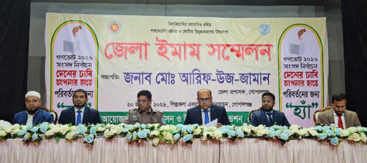 গোপালগঞ্জে “হ্যাঁ” ভোটের পক্ষে প্রচারনা ও মসজিদের খুদবায় বয়ান রাখার আহ্বান জানিয়ে জেলা ইমাম সম্মেলন অনুষ্ঠিত হয়েছে।  সম্মেলনে জেলা প্রশাসক মোঃ আরিফ-উজ-জামান বলেছেন, বাংলাদেশ নির্বাচন কমিশন তথা রাষ্ট্রের পক্ষ থেকে একটি সংস্কারের কথা বলা হয়েছে। আমরা একটি গণতান্ত্রিক রাষ্ট্রব্যবস্থায় রূপান্তরিত হতে চাই , আর এটাই সাধারণ মানুষের আকাঙ্খা। এ লক্ষ্যেই জুলাই আন্দোলন হয়েছিল, আর সে আন্দোলনে আমরা সফল হয়েছি।