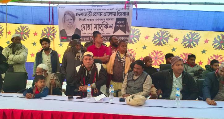 সাবেক প্রধানমন্ত্রী বেগম খালেদা জিয়ার রুহের মাগফেরাত কামনা করে গোপালগঞ্জে আলোচনা সভা, দোয়া ও মিলাদ মাহফিল অনুষ্ঠিত হয়েছে। জেলা শ্রমিক দল এ অনুষ্ঠানের আয়োজন করে।আজ শনিবার দুপুরে গোপালগঞ্জ সদর উপজেলার হরিদাসপুর বিসিক শিল্পী নগরী সংলগ্ন মাঠে জেলা শ্রমিক দলের যুগ্ম আহবায়ক শেখ রিজভী আহম্মদের সভাপত্বিতে অনুষ্ঠিত আলোচনা সভায় যুগ্ম আহবায়ক রহমত সিকদার আক্কু, সদস্য মোঃ সজীব শেখ, কাজী তাছিন (তাসকিন) উপস্থিত ছিলেন। পরে সাবেক প্রধানমন্ত্রী বেগম খালেদা জিয়ার রুহের মাগফেরাত কামনা করে দোয়া ও মিলাদ মাহফিল অনুষ্ঠিত হয়। এরপর দুঃস্থ ও অসহায় মানুশের মাঝে খাবার বিতরণ করা হয়।এসময় বক্তারা বলেন, সাবেক প্রধানমন্ত্রী গণতন্ত্রের মা বেগম খালেদা জিয়ার গণতন্ত্রের জন্য আজীবন কাজ করে গেছেন। আগামী নির্বাচনে বিএনপি মনোনীত প্রার্থীদের ভোট দিয়ে জিতিয়ে আনতে হবে।
