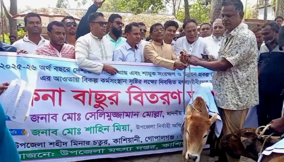 গোপালগঞ্জ-১ আসনের সংসদ সদস্য সেলিমুজ্জামান সেলিম কাশিয়ানীতে ৬০ জন নিবন্ধিত জেলেদের মাঝে বকনা বাছুর বিতরণ