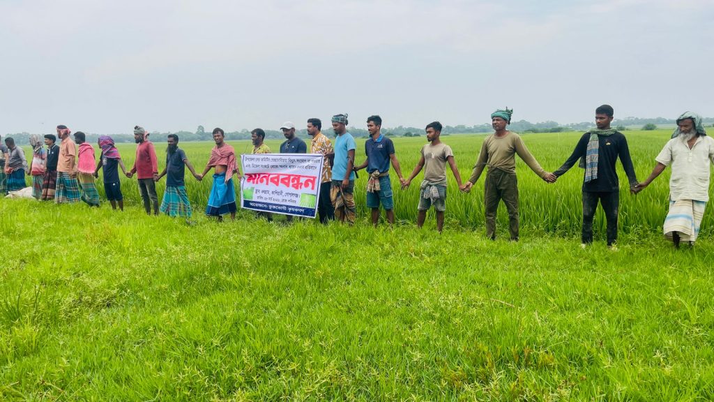 আজ শনিবার (২৮ মার্চ) দুপুরে উপজেলার ফুকরা ইউনিয়নের ধলগ্রাম এলাকায় নিজেদের ফসলি জমিতে দাঁড়িয়ে হাতে হাত ধরে ঘন্টাব্যাপী মানববন্ধন কর্মসূচি পালন করেন ভুক্তভোগী কৃষকরা। এ সময় সেচ সংকটে বোরো আবাদ নিয়ে চরম অনিশ্চয়তার মুখে পড়েছে বলে ক্ষোভ প্রকাশ করে বিভিন্ন শ্লোগান দেন ভুক্তভোগী কৃষকরা। মানববন্ধনে এলাকার অর্ধশতাধিক কৃষক অংশ নেন।মানববন্ধন চলাকালে ভুক্তভোগী কৃষক আব্বাস মোল্যা, মিজান তালুকদার, টিটুল শরীফ ও রিজাউল মোল্যাসহ আরও অনেকে বক্তব্য রাখেন।