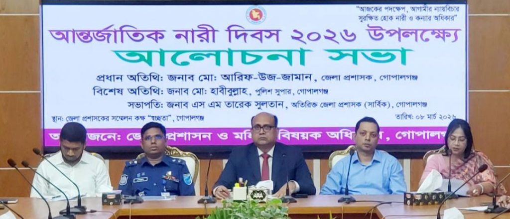 লোচনা সভার মধ্য দিয়ে গোপালগঞ্জে আন্তর্জাতিক নারী দিবস পালন করা হয়েছে। আজ রবিবার (০৮ মার্চ)সকালে জেলা প্রশাসকের সম্মেলন কক্ষে অনুষ্ঠিত আলোচনা সভায় প্রধান অতিথি হিসাবে উপস্থিত ছিলেন জেলা প্রশাসক মোঃ আরিফ-উজ-জামান।অতিরিক্ত জেলা প্রশাসক এস এম তারেক সুলতানের সভাপতিত্বে অনুষ্ঠিত আলোচনা সভায় পুলিশ সুপার মোঃ হাবীবুল্লাহ, জেলা পরিষদের প্রাশাসক আমিত কুমার দেব নাথ,মহিলা বিষয়ক অধিদপ্তরের উপপরিচালক লাখসান লাকী বক্তব্য রাখেন।