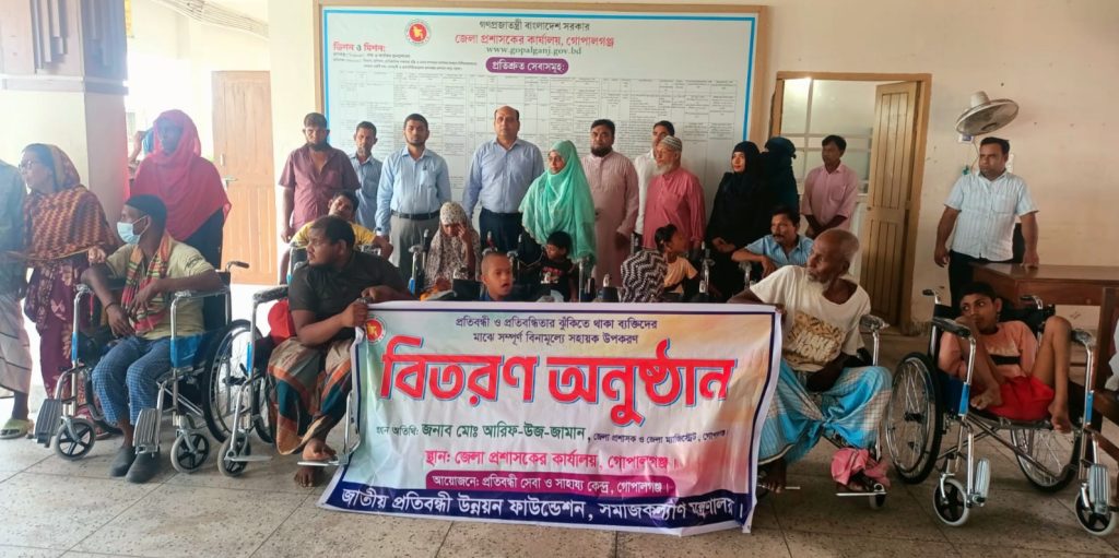 গোপালগঞ্জে বিভিন্ন বয়সের ১৯জন প্রতিবন্ধী পেল হুইল চেয়ারসহ বিভিন্ন উপকরণ।গোপালগঞ্জ প্রতিবন্ধী সেবা ও সাহায্য কেন্দ্র এসব উপকরণ বিতরণ করে।আজ সোমবার (২০ এপ্রিল) দুপুরে জেলা প্রশাসকের কার্যালয় চত্ত্বরে প্রতিবন্ধীর মাঝে প্রধান অতিথি হিসাবে এসব উপকরণ বিতরণ করেন, জেলা প্রশাসক মোঃ আরিফ- উজ- জামান।উপকরণ সমূহ হলো, ১৭টি হুইল চেয়ার, ১টি ট্রাই সাইকেল ও ১টি হেয়ারিং এইড (কানে শোনার মেশিন)।