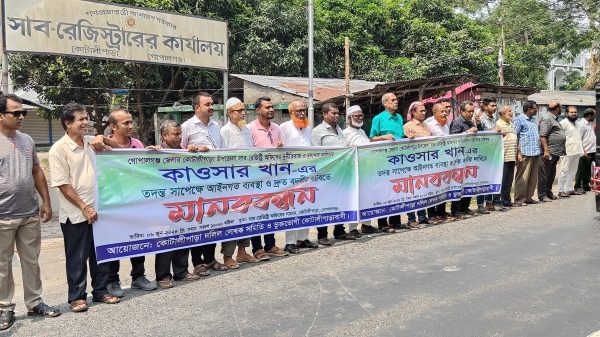 কোটালীপাড়া প্রতিনিধিঃ গোপালগঞ্জের কোটালীপাড়া উপজেলা সাব-রেজিস্ট্রার কাওসার খানের বদলীর দাবিতে মানববন্ধন কর্মসূচি পালন করেছে দলিল লেখক সমিতি। বৃহস্পতিবার (৬জুন) কোটালীপাড়া উপজেলা সাব-রেজিস্ট্রারের কার্যালয়ের সামনের সড়কে সকাল ১০টা থেকে ১১টা পর্যন্ত