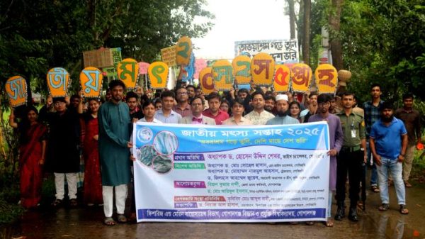 গোবিপ্রবি প্রতিনিধিঃ ‘অভয়াশ্রম গড়ে তুলি, দেশি মাছে দেশ ভরি’ এই প্রতিপাদ্যকে সামনে রেখে গোপালগঞ্জ বিজ্ঞান ও প্রযুক্তি বিশ্ববিদ্যালয়ে (গোবিপ্রবি) জাতীয় মৎস্য সপ্তাহ-২০২৫ উদযাপন করা হয়েছে। এ উপলক্ষে ক্যাম্পাসে বর্ণাঢ্য শোভাযাত্রা,