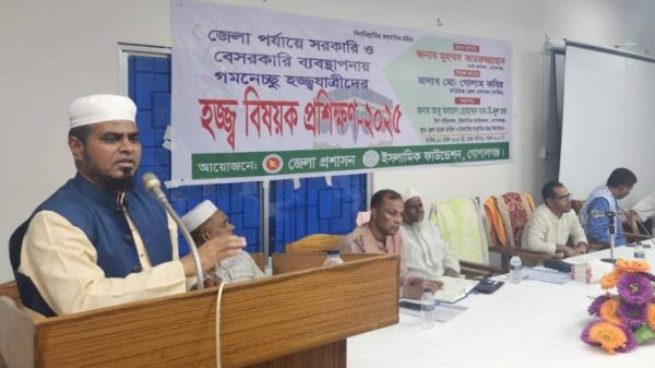 কালের খবরঃ গোপালগঞ্জে জেলা পর্যায়ে সরকারী ও বেসরকারী ব্যবস্থাপনায় গমনেচ্ছু হজ্জ্ব যাত্রীদের হজ্জ্ব বিষয়ক প্রশিক্ষণ কর্মশালা অনুষ্ঠিত হয়েছে।গোপালগঞ্জ জেলা প্রশাসন ও ইসলামিক ফাউন্ডেশন এ প্রশিক্ষন কর্মশালার আয়োজন করে।আজ শনিবার (