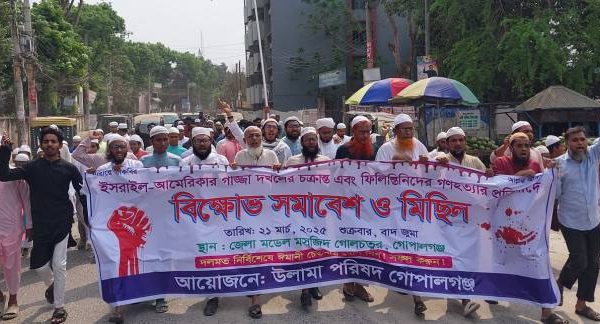 কালের খবরঃ ইসরাইল ও আমেরিকার গাজা দখলের চক্রান্ত ও ফিলিস্তিনিদের গণহত্যার প্রতিবাদে গোপালগঞ্জ ও কোটালীপাড়ায় বিক্ষোভ মিছিল ও সমাবেশ অনুষ্ঠিত হয়েছে। গোপালগঞ্জ ওলামা পরিষদ এ কর্মসূচী পালন করে। আজ শুক্রবার