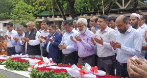 এরআগে,টুঙ্গিপাডায় পৌঁছে বঙ্গবন্ধুর সমাধি সৌধ বেদিতে পৃথকভাবে পুষ্পস্তবক অর্পণ করেন সড়ক পরিবহন ও মহাসড়ক বিভাগের নবনিযুক্ত সচিব এ বি এম আমিন উল্লাহ নুরী, বাংলাদেশ সড়ক পরিবহন কর্পোরেশনের (বিআরটিসি) চেয়ারম্যান তাজুল ইসলাম, বাংলাদেশ সড়ক পরিবহন কর্তৃপক্ষের (বিআরটিএ) চেয়ারম্যান গৌতম চন্দ্র পাল, সড়ক ও জনপথ অধিদপ্তরের প্রধান প্রকৌশলী শোয়েব আহম্মেদ এবং স্থানীয় সরকার, পল্লী উন্নয়ন ও সমবায় মন্ত্রণালয়ের স্থানীয় সরকার বিভাগের নবযোগদানকৃত সচিব আবু হেনা মোরশেদ জামান শ্রদ্ধা জানান। পরে বঙ্গবন্ধু ও তাঁর পরিবারের শহীদ সদস্যদের রুহের মাগফোত কামনা করে ফাতেহা পাঠ ও বিশেষ মোনাজাতে অংশ নেন। এসময় জেলা প্রশাসক কার্যালয়ের স্থানীয় সরকার বিভাগের উপপরিচালক আজাহারুল ইসলাম গোপালগঞ্জ জেলা আওয়ামী লীগের সভাপতি মাহবুব আলী খান, এলজিইডির নির্বাহী প্রকৌশলী এহসানুল হক,সড়ক ও জনপথের ত্বত্তাবধায়ক প্রকৌশলী তাপসী দাস, টুঙ্গিপাড়া উপজেলা চেয়ারম্যান বাবুল শেখ, উপজেলা নির্বাহী কর্মকর্তা মো. মঈনুল হক, পৌর মেয়র শেখ তোজাম্মেল হক টুটুলসহ বিআরটিসি ও বিআরটিএ’র ঊর্ধ্বতন কর্মকর্তা বৃন্দ উপস্থিত ছিলেন।