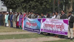 আজ বৃহস্পতিবার (২৬ ডিসেম্বর)স্থানীয় পৌরপার্কের শহীদ মিনারের সামনে দাড়িয়ে কেন্দ্রীয় কর্মসূচীর অংশ হিসাবে সকাল ১১ টা থেকে ঘন্টাব্যাপী মানববন্ধন করে। মানবন্ধনকারীরা হাতে হাত ধরে এ মানববন্ধন কর্মসূচীতে জেলার বিভিন্ন অফিসের ২৫ ক্যাডারের কর্মকর্তারা এতে অংশ নেন।