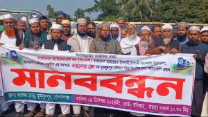 আজ রবিবার(২৯ ডিসেম্বর) বেলা ১১টায় মুকসুদপুর উপজেলা সদরের মুকসুদপুর কলেজ মোড়ে, ঢাকা-খুলনা মহাসড়ক অবরোধ করে ঘন্টাব্যাপী এই মানবন্ধন রচনা করা হয়। আন্দোলনকারীরা হাতে হাত ধরে মুকসুদপুর এলাকার বিভিন্ন শ্রেণি পেশার মানুষ এ মানববন্ধনে অংশগ্রহণ করেন। এসময় সড়কের দুই পাশে শত শত যানবাহন চলাচল বন্ধ থাকে।