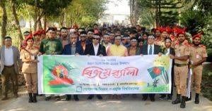 র্যালি শেষে সকাল ১০টায় একাডেমিক ভবনের ৫০১ নং কক্ষে আলোচনা সভা আয়োজন করা হয়। এতে প্রধান অতিথির বক্তব্যে উপাচার্য অধ্যাপক ড. হোসেন উদ্দিন শেখর বলেন, বাঙালি জাতির যত অর্জন রয়েছে, তার মধ্যে শ্রেষ্ঠতম হলো আমাদের এই বিজয় দিবস। তবে গত ৫৫ বছরে আমরা মুক্তিযুদ্ধের চেতনাকে সেভাবে ধারণ করতে পারিনি। আমরা আমাদের পাঠ্যপুস্তকেও মুক্তিযুদ্ধের সঠিক প্রতিফলন রাখতে পারিনি। কারণ একটি নির্দিষ্ট গোষ্ঠী মুক্তিযুদ্ধকে কুক্ষিগত করে রাখতে চায়। অথচ মুক্তিযুদ্ধ আমাদের জাতির একটি সামষ্টিক অর্জন। আমাদের এই বিজয় দিবসকে আরো বেশি আড়ম্বরপূর্ণভাবে উদযাপন করা উচিত ছিলো। আমরা সততার সাথে জীবনযাপন করলেই প্রকৃত স্বাধীনতার স্বাদ পাওয়া যেতো।