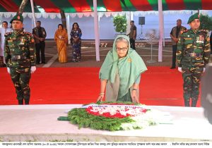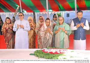 সকাল ১০টা ৫ মিনিটে জাতির পিতা বঙ্গবন্ধু শেখ মুজিবুর রহমানের সমাধি সৌধ বেদিতে পুষ্পার্ঘ অপর্ণ করে গভীর শ্রদ্ধা জানান প্রধানমন্ত্রী শেখ হাসিনা। এসময় কিছুক্ষণ নীরবে দাঁড়িয়ে থাকেন তিনি। পরে বঙ্গবন্ধু ও তাঁর পরিবারের শহীদ সদস্যদের রুহের মাগফেরাত কামনা করে বিশেষ দোয়া ও মোনাজাত করেন। এসময় তাঁর সাথে ছোট বোন শেখ রেহানা, বাগেরহাট-১ আসনের সংসদ সদস্য শেখ হেলাল উদ্দিন, খুলনা-২ আসনের সংসদ সদস্য শেখ সালাউদ্দিন জুয়েলসহ পরিবারে সদস্যরা এবং গোপালগঞ্জে জেলা প্রশাসক কাজী মাহবুবুল আলম, পুলিশ সুপার আল-বেলি আফিফা , জেলা আওয়ামীলীগ নেতৃবৃন্দ উপস্থিত ছিলেন।